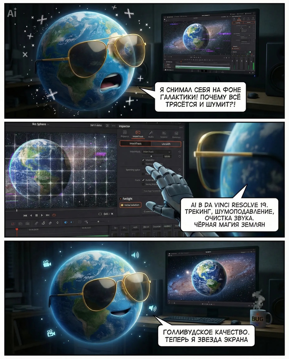 Ико Сфер тоже через это прошёл. Он снял эпичное вращение на фоне галактики. Оператор — он сам. Штатива нет, освещение — только далёкие звёзды, микрофон — встроенный в камеру. Результат — катастрофа. Камера ходуном, небо в пикселях, голос заглушает космический ветер. «Всё, больше никогда», — подумал он и почти удалил файлы. Но вовремя открыл DaVinci Resolve 19.