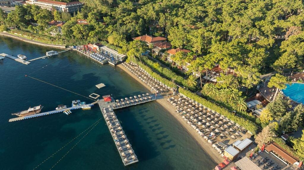 Собственный пляж в 100 м от корпусов, 2 открытых бассейна, 3 водные горки и спа-центр. Расстояние до центра Мармариса - 4 км. Кухня заслуживает отдельной похвалы: готовят турецкие и итальянские блюда, свежие морепродукты. Основной ресторан - «шведский стол». Также есть 4 бара и кафе с огромным выбором алкоголя и безалкогольных напитков. Спа-центр впечатляет: традиционный хаммам, сауна, разнообразные массажи. Здесь можно и поправить здоровье. Для этого в центре оборудовано 10 массажных кабинетов. К услугам гостей косметологи. За наст