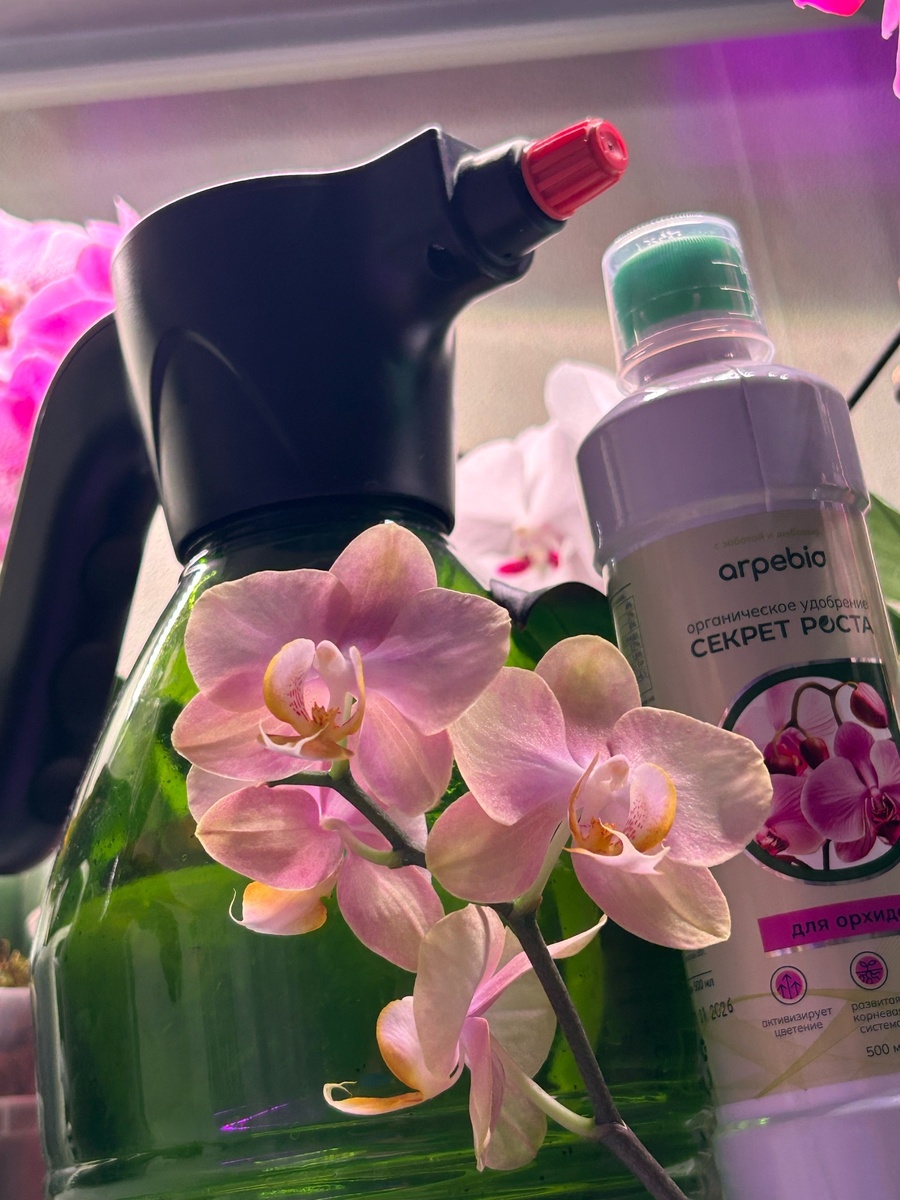 Частота. Достаточно нескольких процедур в неделю. В жаркую погоду можно опрыскивать несколько раз в день. Важно, чтобы листья успевали высохнуть до ночи — это снижает риск загнивания. Вода. Используйте мягкую, очищенную или отстоянную воду с минимальным содержанием примесей. Температура воды — комнатная или на пару градусов теплее. Время. Лучшее время — утренние часы или первая половина дня. Желательно, чтобы было солнечно и тепло, но растение должно быть защищено от прямых солнечных лучей — капли воды могут стать линзами и вызвать ожоги листьев. Направление струи. Струю воды направляют снизу вверх или перпендикулярно стволу. Опрыскивайте с нижней стороны листьев. После процедуры. Если волнуетесь, что загниет, то удалите излишки влаги из пазух листьев и с шейки растения с помощью бумажного полотенца или мягкой тряпочки. Я не удаляю В воду я добавляю органическое удобрение. Сейчас я использую органическое удобрение от фирмы ARPEBIO Секрет Силы. Подкормка растения таким способом очень эф