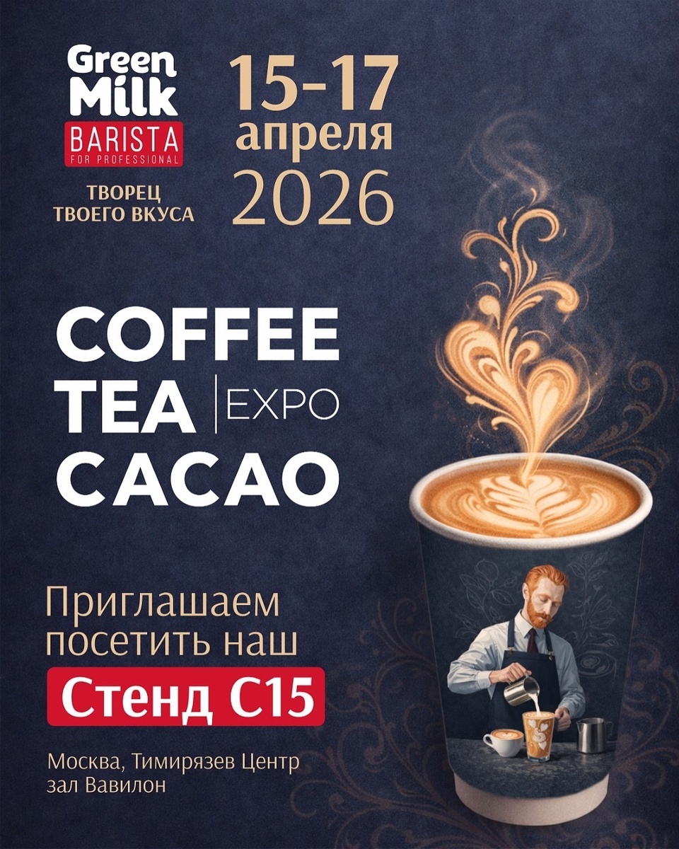 С нетерпением приглашаем вас на выставку Coffee Tea Cacao 2026, которая пройдет с 15 по 17 апреля! Мы приготовили для вас массу интересного: латте арт, два мастер-класса и, конечно же, вкусный кофе на основе Green Milk! 📍 Где нас найти? Москва, Тимирязев центр, зал Вавилон, стенд С15. Запоминайте адрес! 📝 Что вас ждет? • Мини чемпионат по латте арту – покажите свои навыки или просто насладитесь искусством бариста! • Два мастер-класса от нашего шеф-бариста Ивана Маха и амбассадора Green Milk Любы Котовой. Узнайте секреты приготовления идеального кофе! • Кофе на основе Green Milk – попробуйте наш продукт в действии и ощутите разницу! • 🫰🏻 Мини-чемпионат для всех желающих – повзбивайте молоко Green Milk на кофемашине, создайте свой уникальный напиток и прокачайте свои навыки! Часы работы выставки: • 15-16 апреля с 10:00 до 18:00 • 17 апреля с 10:00 до 17:00 Не забудьте сохранить это сообщение, поделиться с другом и сделать репост! Это будет отличное напоминание о вашем предсто