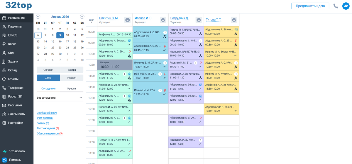 - Цветное расписание с индикацией загрузки врачей