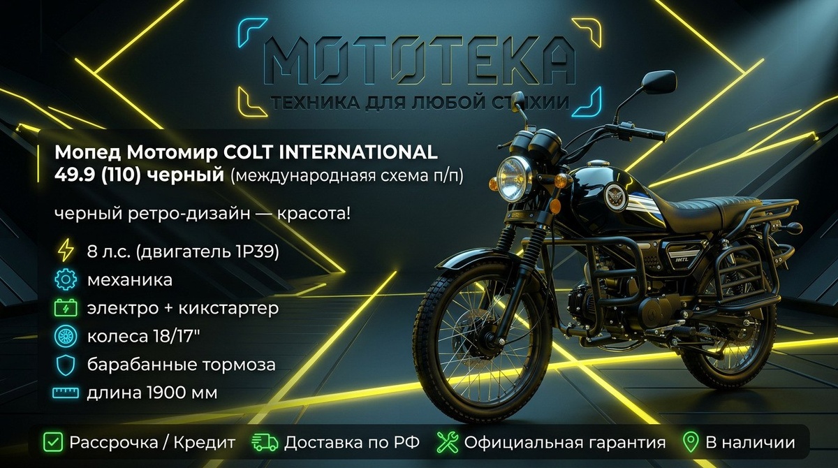 Коллеги, технические данные по мопеду Мотомир COLT INTERNATIONAL (черный, 50/110 см³, международная схема). 🔹 Двигатель: 1P39, 50 см³ (юридически), 4-тактный, 1 цилиндр, мощность 8 л.с. 🔹 Трансмиссия: Механическая. 🔹 Стартер: Электро + кикстартер. 🔹 Колеса: 18/17 дюймов, шины 2.50-18 / 2.75-17. 🔹 Тормоза: Барабанные (перед/зад). 🔹 Габариты: 1900×660×1100 мм. 🔹 Документы: Без ПТС. Ключевая особенность — классический ретро-дизайн, международная схема поставки и надежная механика. Ссылка на товар: https://clck.ru/3T4Zpv #Мотомир #COLTINTERNATIONAL #Мопед #Техника #МотоТека #Спецификация #Ретро