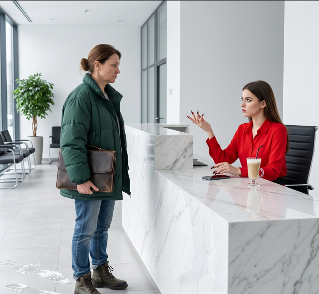 Резкий скрип мокрых резиновых подошв по итальянскому керамограниту прозвучал в холле как выстрел. Пожилой мужчина в плотной рабочей куртке с логотипом логистической службы неловко переступил с ноги на ногу, оставляя на идеальном полу грязные следы от тающего снега.