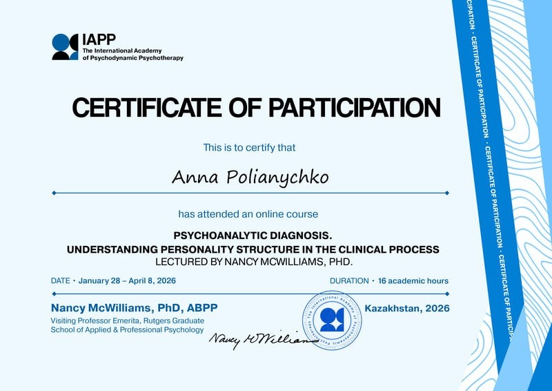 Получила сертификат по психоаналитической диагностике у Nancy McWilliams