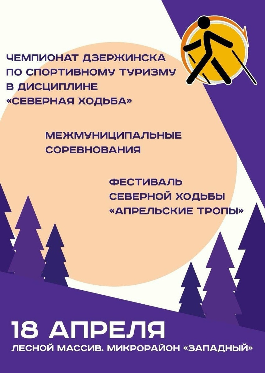 В субботу, 18 апреля, на территории западного лесного массива в Дзержинске состоится Чемпионат города по спортивному туризму в дисциплине «северная ходьба», а также межмуниципальные соревнования и фестиваль северной ходьбы «Апрельские тропы». Соревнования пройдут в лесном массиве микрорайона «Западный». Подробная информация и регламент доступны на сайте организаторов.