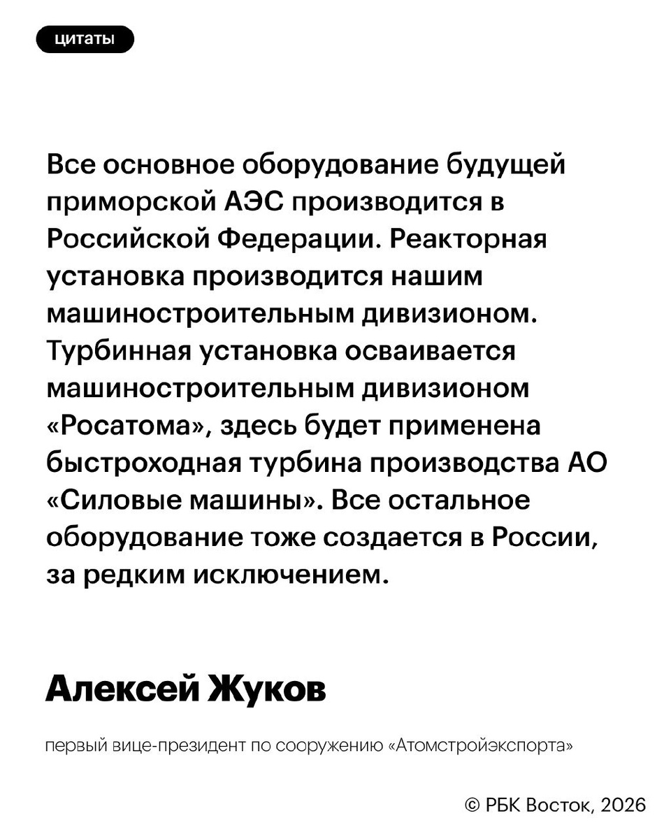 Дальний Восток станет атомным макрорегионом. Здесь предусмотрено строительство крупных АЭС и атомных станций малой мощности. Первым субъектом, где появится полноценная АЭС, будет Приморье — строительство двух энергоблоков по 1 тыс. МВт должно начаться уже в конце 2027 года. О том, как будет реализовываться проект, РБК Приморье рассказал первый вице-президент по сооружению «Атомстройэкспорта» Алексей Жуков. Подробнее - читайте на нашем сайте. 🔗 РБК Восток в Telegram и MAX