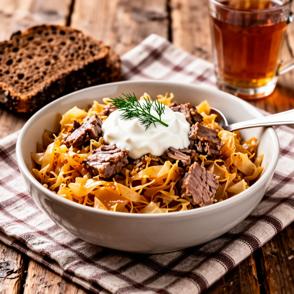 Тушёную капусту с мясом подавали как самостоятельное блюдо - без гарнира. Только кусок чёрного хлеба и, если повезёт, ложка сметаны сверху.