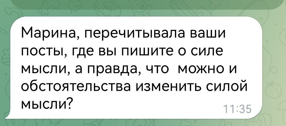 Отвечаю🙌 Как изменить обстоятельства силой мысли✨ Дорогие мои, вы часто спрашиваете: можно ли на самом деле влиять на свою жизнь просто мыслями? Не магия, не заклинания, а обычные, каждодневные мысли. Отвечаю: можно. Но не так, как показывают в ярких картинках. Перемены начинаются не с того, что вы «начнёте больше работать» или «найдёте нужные связи». Они начинаются внутри. С того, о чём вы думаете, что вы себе представляете, в каком состоянии живёте день за днём. Мы создаём реальность не только действиями. А тем, на какой волне мы находимся. Какая у нас вибрация. Какое настроение внутри. 🍀Давайте разберём по шагам. 1. На чём фокус — то и растёт Если вы каждый день прокручиваете в голове: · «У меня не получается» · «Денег нет» · «Я никому не нужна» …ваше подсознание слышит это как команду. И делает всё, чтобы вы оказались правы. Потому что для него нет слов «не» и «нет». Оно слышит только образ. 🌿Что делать? Не ругать себя. А мягко, шаг за шагом, переводить фокус туда, ку