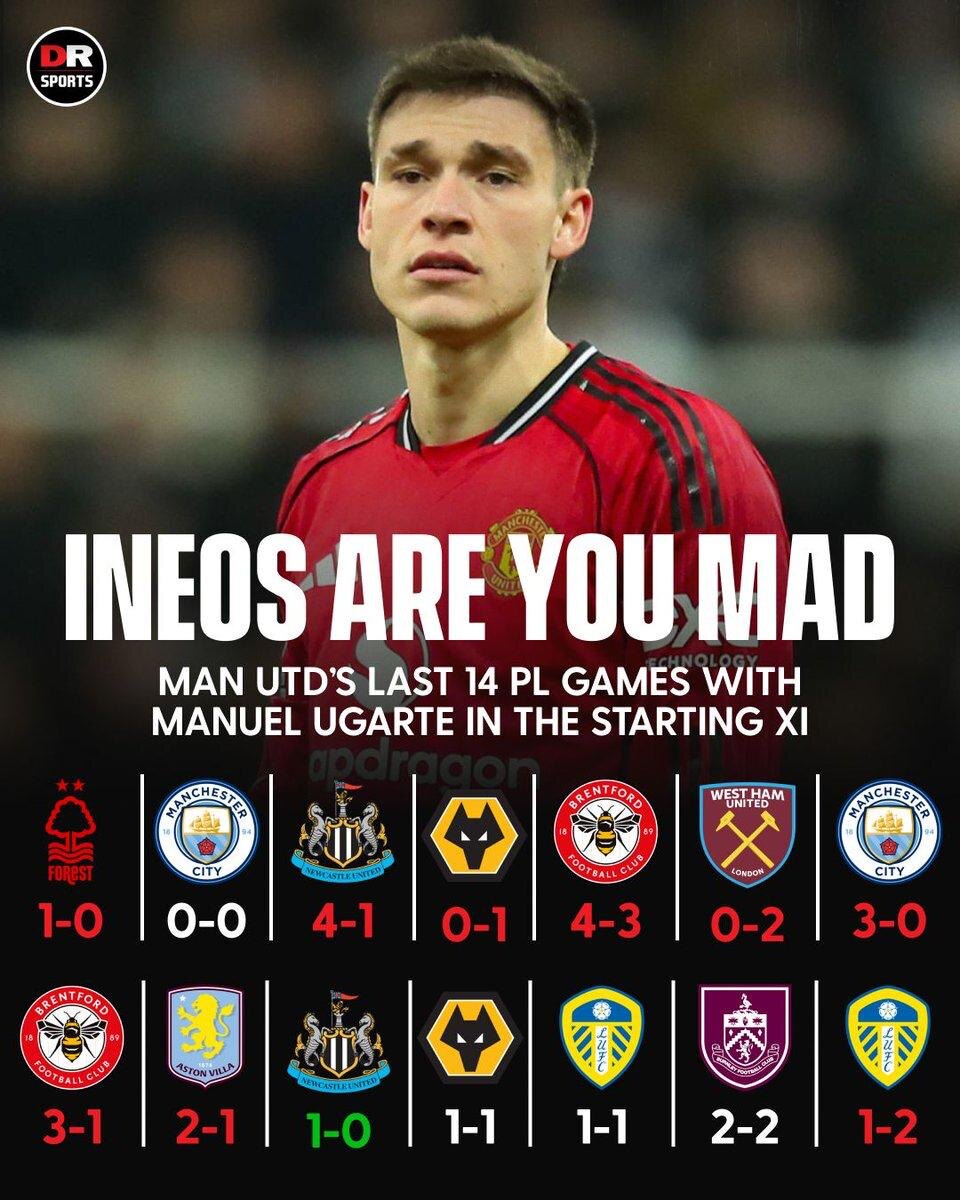 "Манчестер Юнайтед" выиграл только один из 14 последних матчей Премьер-Лиги, на которые Мануэль Угарте выходил в стартовом составе 😲