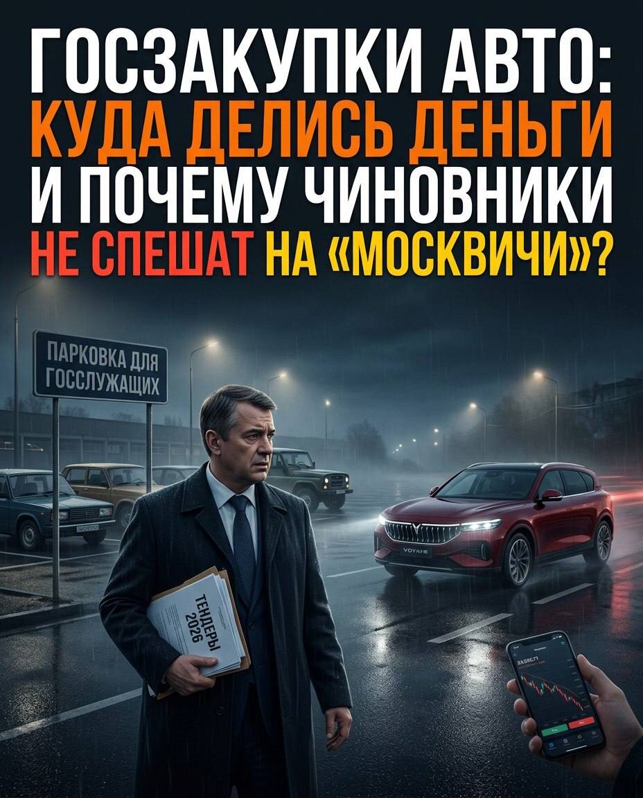 »? 📉Госзакупки автомобилей рухнули. И это при том, что нам постоянно твердят: «Пересаживаем чиновников на отечественное!» Что происходит на самом деле? Давайте разбираться👇🏻 1⃣Цифры говорят сами за себя. За первый квартал 2026 года количество тендеров на госзакупки авто сократилось на 26-30% в штуках. В деньгах падение еще жестче: от 19% до 42%. Это данные «Тендерплана» и «Контур. Закупки». Серьезно, да? 2⃣Средняя цена контракта тоже просела – на 17%, до 4 миллионов рублей. Это значит, что если и покупают, то подешевле. Экономия или просто нет денег? 3⃣А теперь самое интересное. Минпромторг одобрил 15 марок для госслужащих. Тут и АвтоВАЗ, и «Москвич», и УАЗ, и Sollers. Плюс китайцы: Evolute, Voyah, Haval, Xcite, Kaiyi, BAIC. И даже Aurus, «Амберавто», SWM, Citroen. 4️⃣Но что покупают? Lada просела на 32% в тендерах и на 42% в деньгах. УАЗ – минус 34% и минус 44% соответственно. А «Москвич»? Тут вообще катастрофа: минус 63% тендеров и минус 73% денег. ❌Видимо, чиновники не в вос