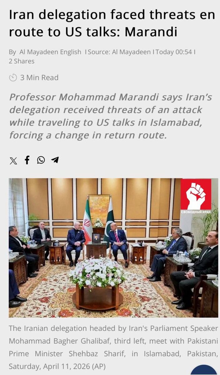 🚨 Иранская делегация, летевшая на переговоры с США, получила предупреждения о возможной атаке на самолёт по пути в Пакистан; после усиления мер безопасности возвращение в Тегеран пришлось организовать другим маршрутом. Источник: Al Mayadeen, Маранди. Подпишитесь на канал