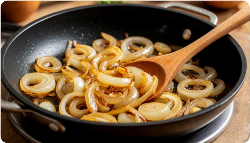 - «Водяная» карамелизация: Добавьте на сковороду с луком немного воды или бульона (около половины стакана) и накройте крышкой. Жидкость помогает луку быстрее размягчиться, после чего можно открыть крышку и выпарить влагу до получения золотистого цвета. Этот метод мягче и дает более нежный результат.