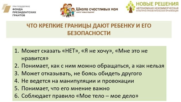 Три необходимых шага к выстраиванию безопасности ребенка: 1️⃣Укрепление личных границ. 2️⃣Формирование рабочей информации: убеждения и мнения. 3️⃣Обучение ребенка конкретным навыкам, действиям. 🫥На занятии рассмотрели личные границы в разных сферах: мое тело, мои личные вещи, мое мнение, мои действия. Мамы узнали о практиках, с помощью которых можно помочь ребенку исследовать свои границы, и некоторые из них прожили сами. В результате случилось много ценных открытий: «Как здорово на себя посмотреть». «Я поняла, что у меня самой слабые границы». «Осознала, что из этого можно сделать игру замечательную для детей на весь вечер, супер». ⛔️Два важных правила на границах: - Уважаю границы других людей. - Замечаю, что мою личную границу нарушают. ❗️Именно крепкие границы дают ребенку возможность твердо говорить: «Нет», не вестись на провокации и быть уверенным, что его мнение важно, а своим телом распоряжается только он сам. ✅Следующий шаг – формирование рабочей информации, то есть той,