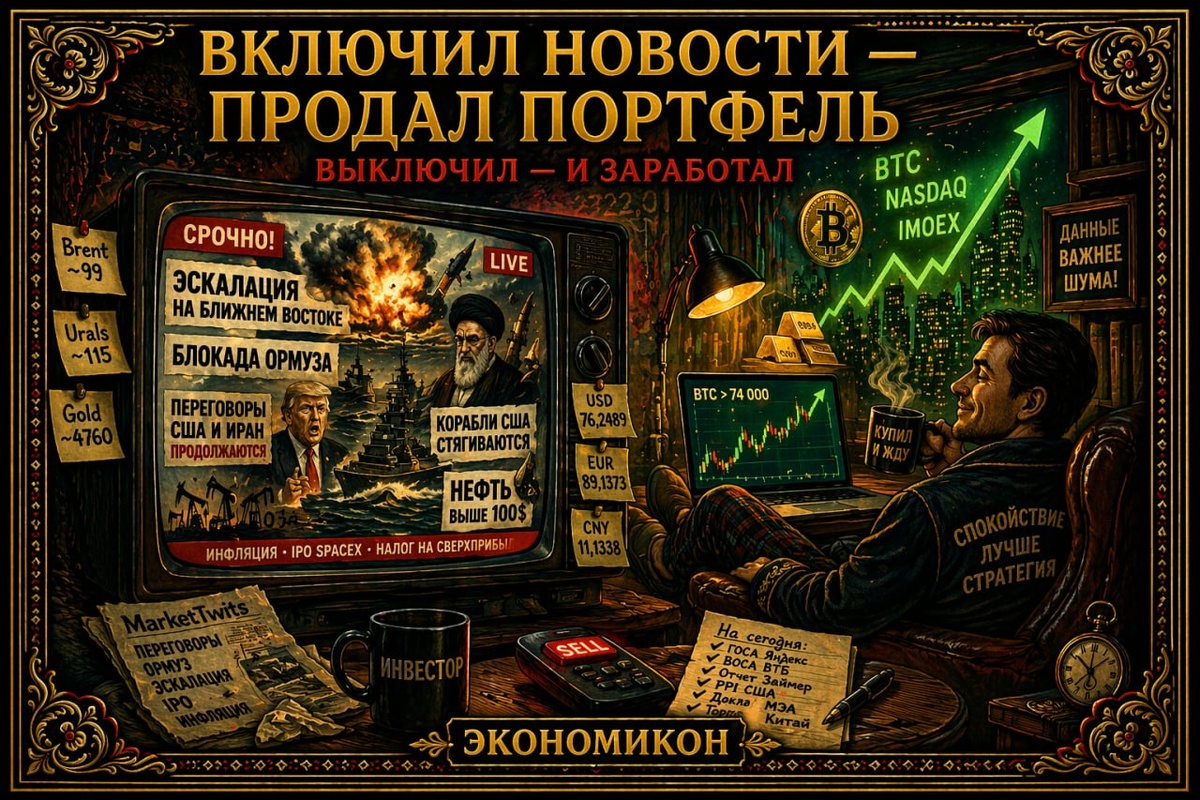 ! На связи утренний дайджест ЭКОНОМИКОН ☕️ Вторник. 14 апреля. 💱 Валюта и сырьё на сегодня: $ — 76,25 € — 89,14 ¥ — 11,13 Gold — ~4760 Brent — ~99 Urals — ~115 📊 Сегодня в календаре ▪️ Яндекс — ГОСА, дивиденды на повестке (110 ₽ на акцию) ▪️ ВТБ — вопрос допэмиссии через конвертацию префов ▪️ Займер — операционные результаты за 1кв ▪️ Китай — торговля за март ▪️ США — PPI и рынок труда (ADP) ▪️ МЭА — доклад по нефти День плотный. Данных много, поводов для движений — тоже. 🌍 Геополитика — Ормуз держит всех за горло ▪️ США усиливают давление и стягивают флот ▪️ Китай продолжает гонять танкеры через пролив ▪️ Саудиты требуют снять блокаду, но сами же говорят о наземной операции ▪️ Переговоры США–Иран продолжаются, следующий раунд — 16 апреля ▪️ Риторика скачет: от «договоримся» до «через 2 недели будет неприятно» Ситуация не про ясность. Скорее про то, кто первый моргнёт. 🛢 Нефть и энергия — нервный баланс ▪️ Brent держится около 100 ▪️ Urals уже ~115 ▪️ США ждут открытия Ормуза