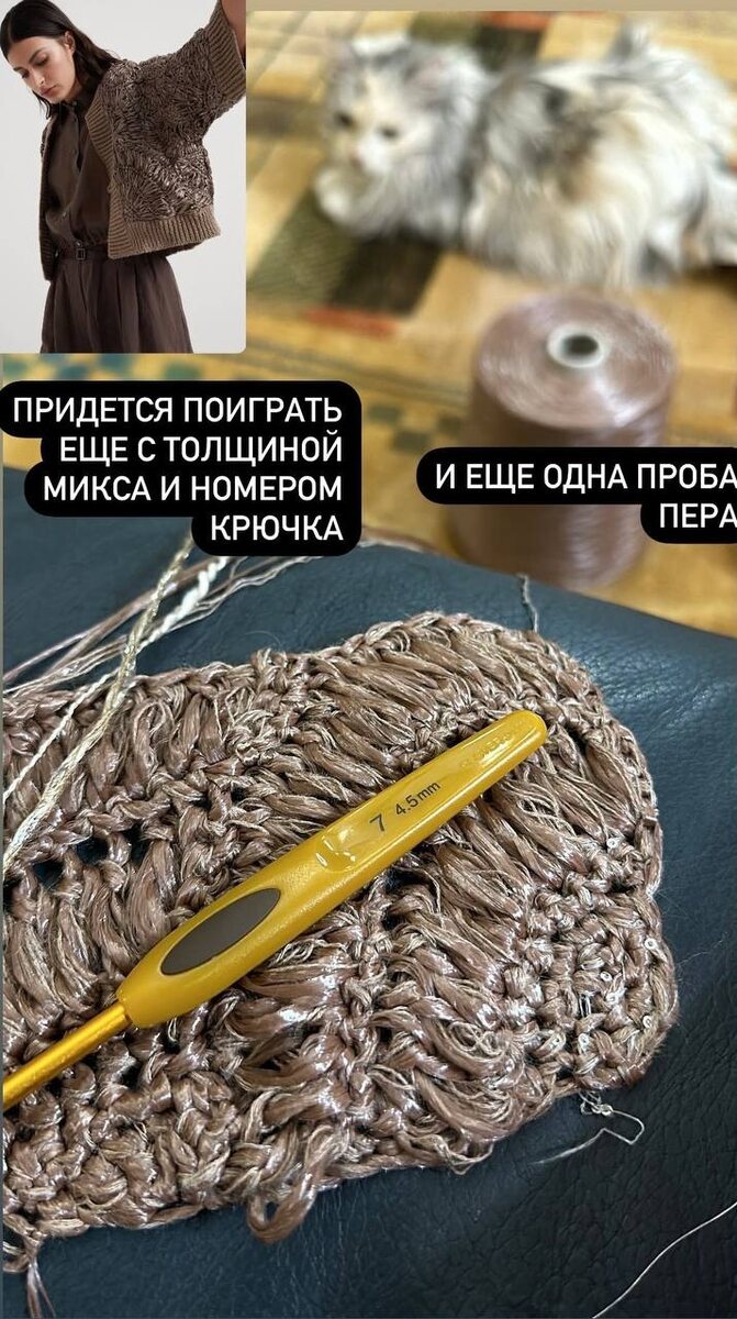 !! И так мечта о кардигане и долгий путь в полтора года , а может и дольше Первая проба этого узора - рафия бобинная Но боялась этой тактильности не похожей на обычную пряжу Пробовала подмот Потом я стала смелее и связала из этой рафии кардиган Потом появилась вот такая cupro rafia Китайской фабрики BEST Shan И потом белая целлюлоза И потом уже коричневый цвет не оставил меня равнодушной И я начала этот проект И ссылка на Дзен https://dzen.ru/a/ad3oM8papGKWXoYX