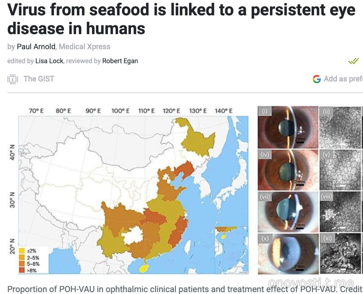 Нодавирус вызывает воспаление глаз и повышает внутриглазное давление. Без лечения — полная слепота. Заражаются через сырые морепродукты и слабосолёную рыбу. Вакцины нет. Вирус уничтожает только термическая обработка. оновости.