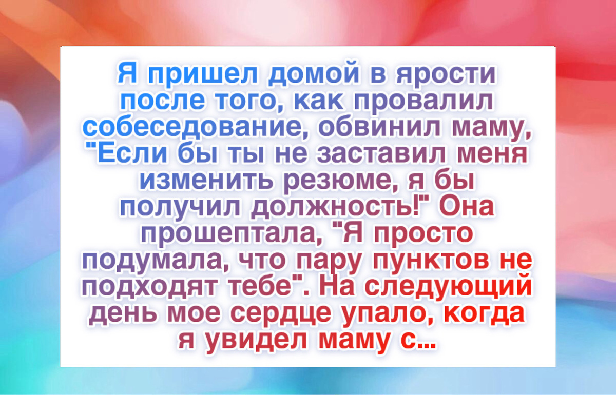 “Я вернулась домой в ярости после проваленного собеседования и обвинила во всем маму. На следующее утро я узнала, что ее советы помогли мне получить еще более подходящую должность в той же компании. Ее вмешательство оказалось не критикой, а тихой заботой о моем будущем.”