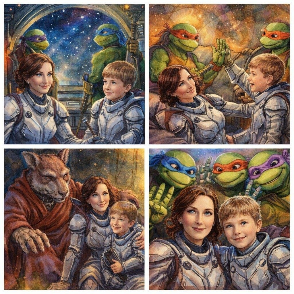 От подписчицы @peraspera0ad0astra Создай сетку из 4 кадров под комикс. Каждый кадр СОВЕРШЕННО НОВЫЙ и УНИКАЛЬНЫЙ добавить дополнительных героев из исходника 1 - женщина (создать точную копию лица 1:1, аккуратный макияж без искажений возраста и индивидуальной асимметрии лица, прическа воздушные переплетения, цвет волос каштановый; одежда футуристическая текстуры и кроя) и мальчик (создать точную копию лица 1:1, без искажений возраста и индивидуальной асимметрии лица; одежда футуристической текстуры и кроя). В сюжете на всех 4 кадрах обязательно использовать одного или нескольких основных героев - Donatello, Leonardo, Michelangelo, Raphael, Splinter - совместить каждый кадр по сюжету с дополнительными героями из исходника 1 женщиной и мальчиком. Стиль: акварель ручной работы, каждый кадр детально прорисован , мягкое теплое освещение, палитра с глубокими оттенками космического, тонкие линии, оттененные контрастами, кинематографичная композиция. most-AI.com - 80+ популярных нейросет