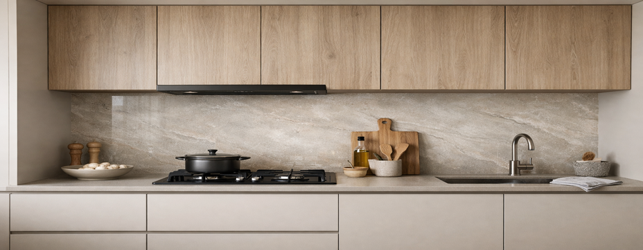 На практике чаще выбирают спокойные решения: однотонные панели, текстуры под камень или дерево, нейтральные декоративные варианты. В актуальных кухнях преобладают однотонные поверхности, имитация камня или дерева, нейтральные текстуры, которые работают как фон и не перегружают интерьер.