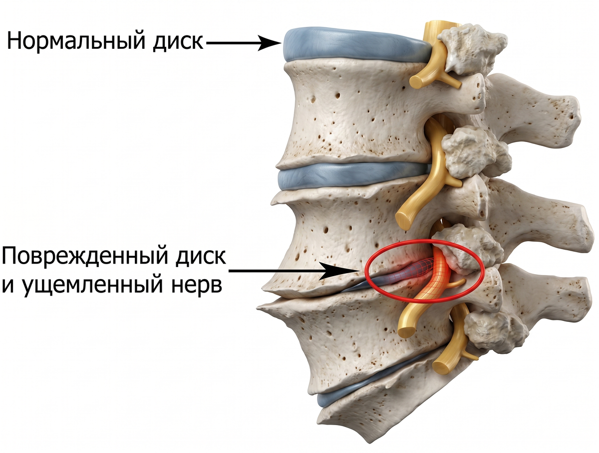 Знакомая ситуация: вы просто наклонились завязать шнурки или подняли не самую тяжелую сумку из багажника, и вдруг — резкая, как удар током, боль. «Прострелило», — думаете вы, замирая в нелепой позе. На картинке выше наглядно показано, что в этот момент происходит «под капотом» нашего организма. Давайте разберем этот процесс на детали. Чаще всего причиной «прострела» (в медицине — люмбаго) становится конфликт между межпозвоночным диском и нервным корешком. Посмотрите на нижнюю часть изображения. Поврежденный диск теряет свою высоту и эластичность. Его содержимое может начать выпячиваться наружу (грыжа или протрузия), зажимая нерв, который проходит буквально в миллиметрах. Результат — та самая молниеносная боль. Многие удивляются: «Болит поясница, а тянет в ногу или ягодицу!».