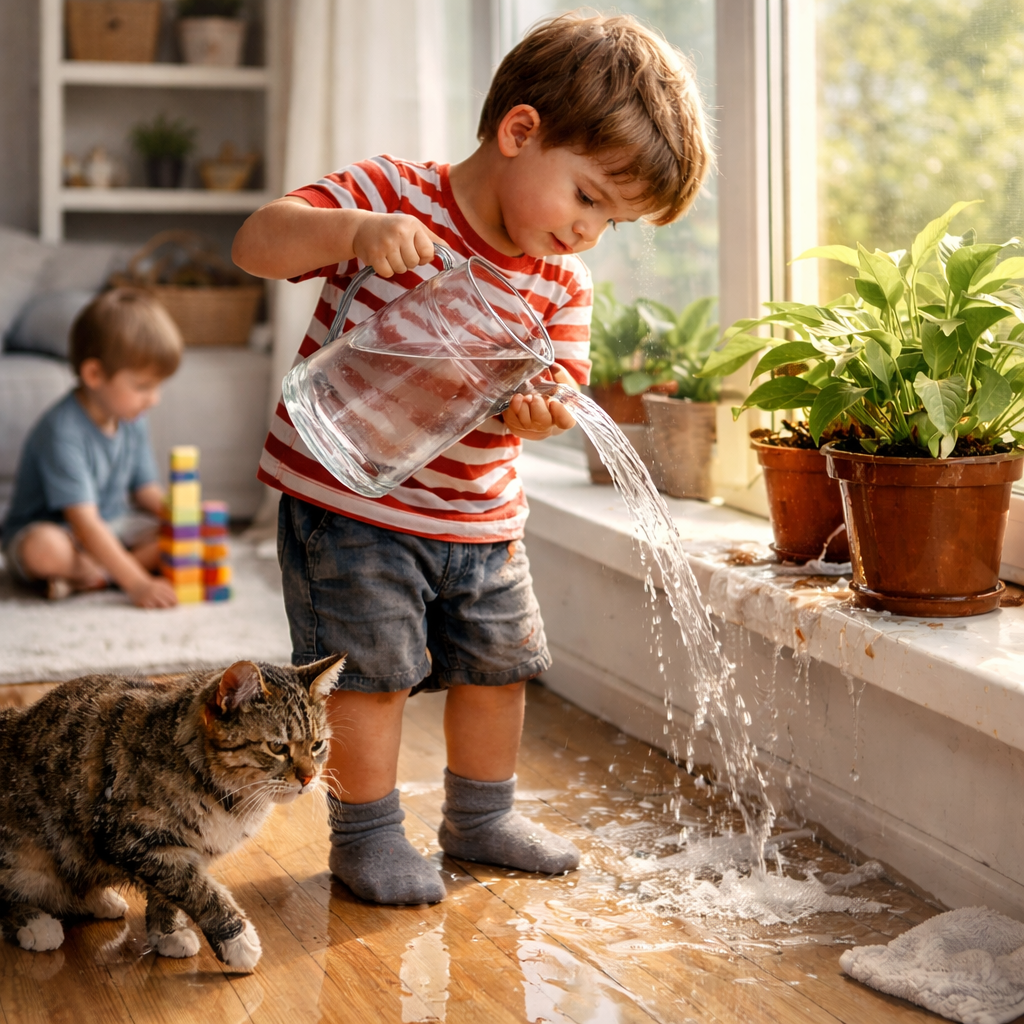 Дело было утром, когда кофе еще не успел спасти мир, а Даша уже требовала внимания, Миша строил башню века, а Максим… Максим решил полить цветы. Сам. Конечно же. Он взял кувшин. Настоящий. С водой. И в этот момент время замедлилось, как в кино. Я стою, смотрю, как мой пятилетний герой аккуратно идет к подоконнику… и — водопад. Не полив, а Ниагара. Пол, носки, кот (бедный кот) — всё в воде. И вот тут у меня внутри началась битва: «Сейчас я всё заберу и сделаю сама» против «Подожди… а вдруг это важно?» Я выбрала второе. С трудом. Через внутренний скрежет. Мы вытерли лужу вместе. Он снова налил воду. Снова пошел. И на этот раз — почти получилось. И вы бы видели его лицо! Эта гордость, этот блеск в глазах… В такие моменты хочется кричать: «Посмотрите, какой он молодец!» Именно тогда я пошла читать, искать, копать — как вообще формируется эта самая уверенность в себе у малышей. И нашла простую мысль: детям важно чувствовать, что они могут, что им можно пробовать, ошибаться и всё равно быть