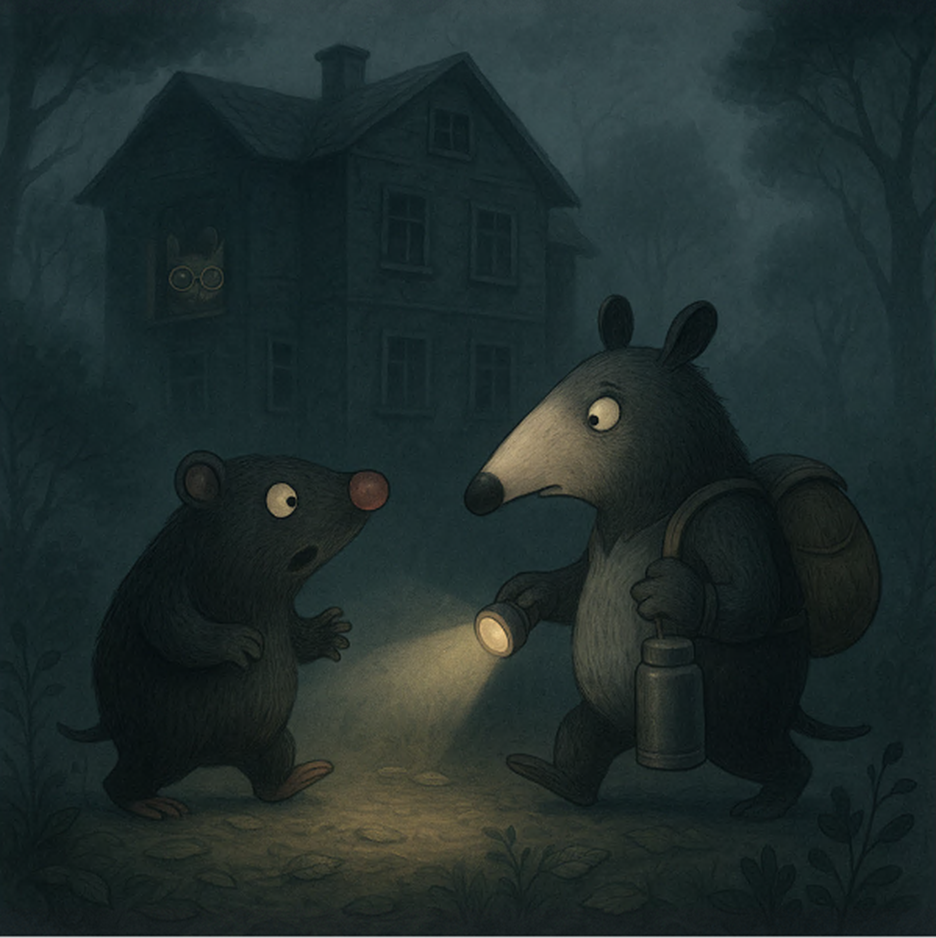 — Оно опять! — зашептал Кротон. — Где? — спросил Тапир, хотя уже сам уставился на третий этаж. Одно из окон в заброшенном доме в чаще тихо светилось. Не моргало. Не ярко. Просто… горело. Прошлой ночью светилось другое. Ещё раньше — вообще подвал. И ни разу — дважды одно и то же. — Там кто-то живёт, — шептал Кротон. — Или оно живёт, — шептал Тапир. — Или это лес. И чем больше они обсуждали, тем больше боооялись. И, конечно…тем больше хотелось пойти внутрь. ________________________________________ Они построили 16 гипотез, включая: • "Блуждающий Электрик" — призрак, ищущий розетку. • "Старый Мёд" — дед, забывший, что пчёл больше нет, но всё ещё включает свет, чтобы проверить. • "Многоламповый Барсук", который живёт в разных комнатах, чтоб не платить ипотеку. — А может, это просто ошибка проводки? — предложил Кротон. — Кротон, ну ты серьёзно? Лес не может ошибаться в проводке! — возмутился Тапир. И, конечно, было решено: пойти ночью. С фонарём. И термосом (чтобы хоть один источник тепла б