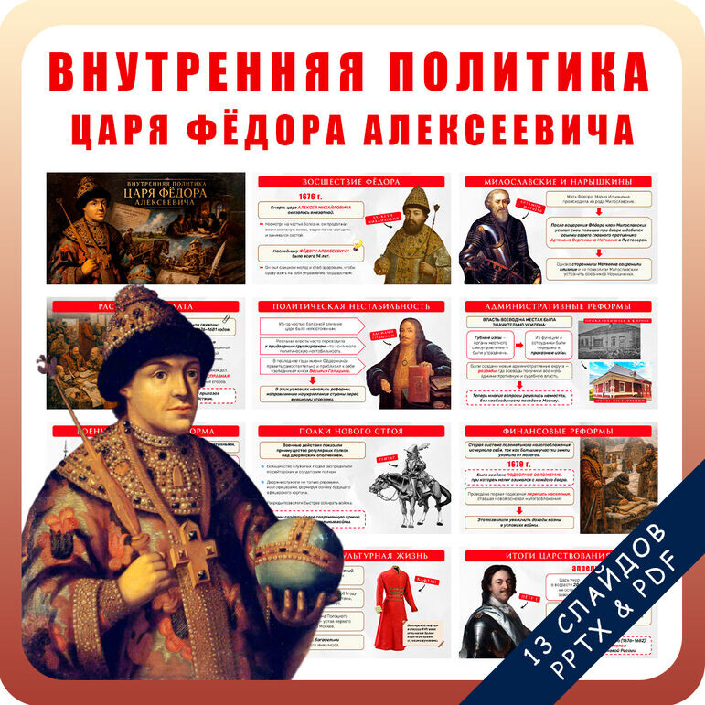 Презентация по истории России «Внутренняя политика царя Фёдора Алексеевича (1676–1682)» 7 класс §45 (ФГОС, УМК Мединский) Презентация посвящена ключевым событиям внутренней политики России во второй половине XVII века при царе Фёдоре Алексеевиче: борьбе придворных группировок, административным и военным реформам, налоговой системе, духовной и культурной жизни, а также подготовке государства к будущим преобразованиям Петра I. Слайды презентации: Презентация сохраняет логическую структуру учебника, что позволяет учащимся проследить последовательность политических процессов от смерти Алексея Михайловича до подготовки государства к реформам Петра I. Материал содержит конкретные даты, события, имена исторических деятелей, ключевые термины и краткие тезисы для удобного восприятия и запоминания. Презентация помогает школьникам сформировать целостное представление о внутренней политике государства, роли придворной элиты и реформаторских усилиях, а также подготовиться к урокам, проверочным рабо