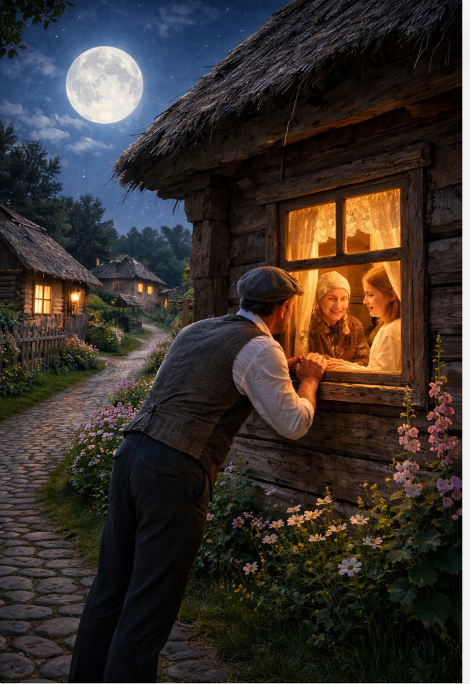 Ваня на стуле сидит, прикрыв глаза, перебирает пальцами по кнопкам, а Варя стоит рядом, сбоку и как бы за спиной, положив руку на стул, во второй руке держит платочек… поёт, чуть прикрыв глаза, льётся девичий голос…