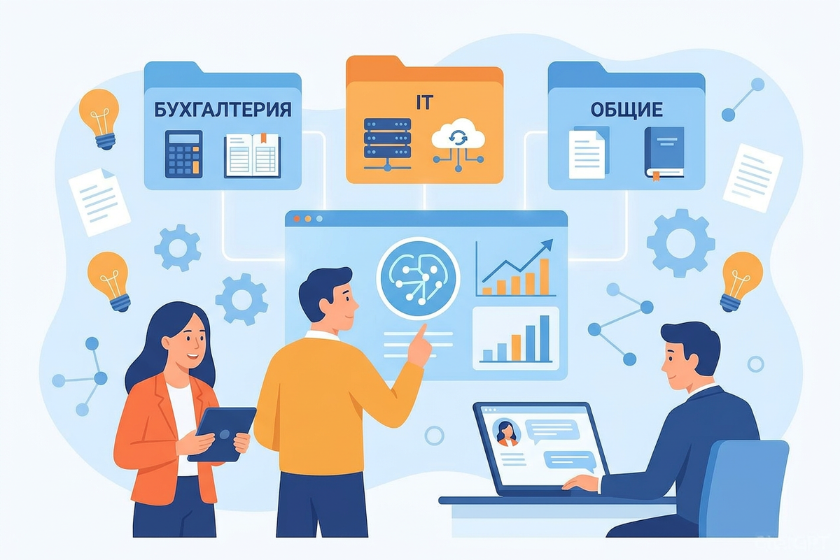 При этом у заказчика сразу было важное требование: знания должны быть разделены. У бухгалтерии — свой набор документов, у ИТ‑службы — свой, у сотрудников общего профиля — свой. Эти базы не должны пересекаться между собой, чтобы пользователь получал ответы только из своего контура знаний.