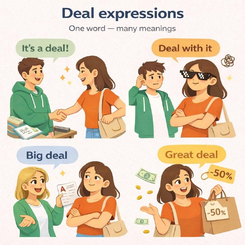 💰 Слово "deal" — это не только "сделка"! В разговорном английском с ним десятки выражений. Разбираем самые популярные фразы. 🤝 IT'S A DEAL — по рукам, договорились **Значение** Согласие на предложение, сделка состоялась Примеры: — Let's meet at 5 PM. — It's a deal! (Договорились!) — I'll pay for lunch if you pay for dinner. — Deal! (Идёт!) — $100 for the bike? — It's a deal! (По рукам!) Синонимы: Agreed! / Done! / You got it! 💪 DEAL WITH IT — смирись, справляйся **Значение** Прими ситуацию, ничего не поделаешь (часто грубовато) Примеры: — I don't like this rule. — Well, deal with it! (Смирись!) Life is hard. You just have to deal with it. (Жизнь тяжёлая. Просто смирись.) I don't care what you think — deal with it! (Мне всё равно, что ты думаешь — принимай как есть!) ⚠️ Внимание: Может звучать грубо! Используйте осторожно. 🎭 BIG DEAL — подумаешь, ну и что **Значение 1** Ирония, сарказм "подумаешь!" — I got a B on the test! — Big deal! I got an A. (Подумаешь! У меня пятёрка.) — H