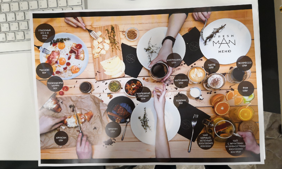 Разбирала свое портфолио. Листаю проекты. Дохожу до старого кейса. Я его почти забыла. А он работает. Меню для Freshman. Барбершоп премиум-класса. Фриланс-проект, который делала далеко в 2016 году. И вот сейчас, пересматривая его, понимаю: да, это всё ещё хорошо. Freshman - барбершоп, кофейня с завтраками и десертами. Нужно меню. Не просто список услуг и цен, а чтобы запомнилось. Чтобы выделялось среди конкурентов. Чтобы человек взял в руки и не положил обратно через 2 секунды. Клиент сказал: «Хотим что-то живое. Не как у всех». Стандартная вёрстка списком мимо. Я предложила живое. Вид сверху на стол. Всё, что есть в барбершопе: расставлены блюда. Воздушный миндальный круассан, шоколадное пирожное с палочкой корицы, чай со свежими фруктами, черный как нефть кофе, капучино с молочным рисунком, сочная яичница с беконом и свежими овощами. К каждому элементу тянутся руки. Без лиц, без лишних деталей. Только предметы, руки и ощущение «хочется взять». Никаких нейросетей в 2016 году о них даж