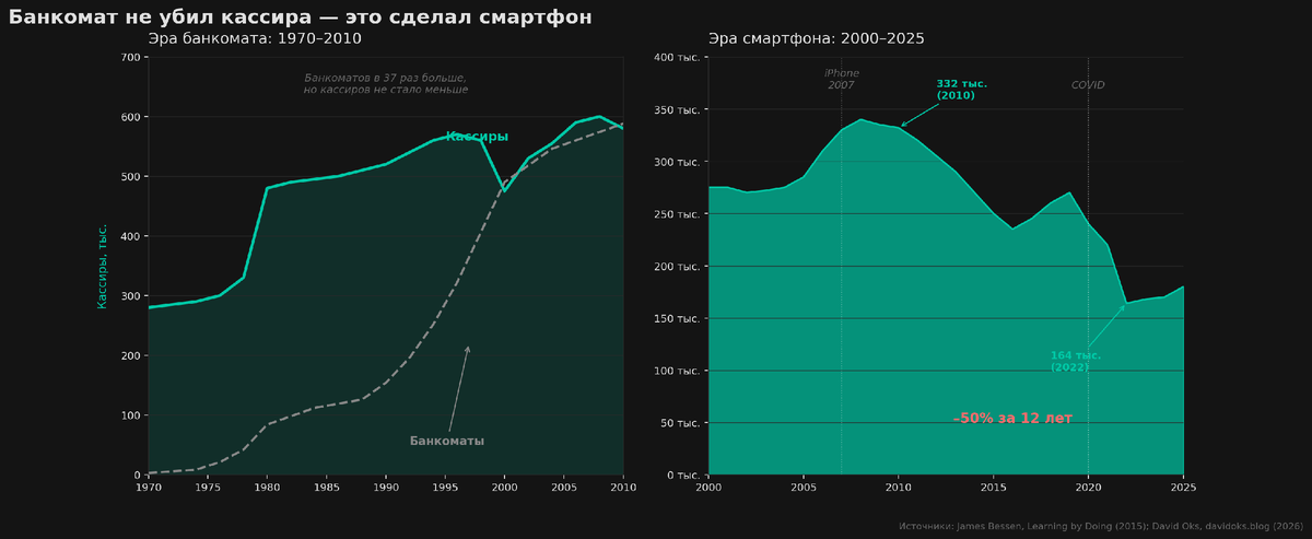 Но получилось ровно наоборот, число кассиров выросло примерно с 300 000 в 1970 году до более чем 600 000 к началу 2000-х. Сработал классический эффект Джевонса.