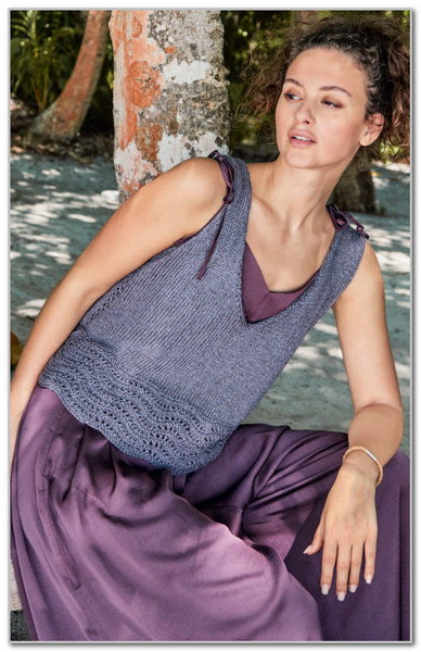 Перевод из журнала "Verena Stricktrends", № 2, 2026 г. Широкий бордюр с волнистым узором по нижнему краю, узкие ажурные полоски по бокам и видимые убавки у V-образного выреза — благодаря этим деталям серо-коричневый топ берет курс на лето.