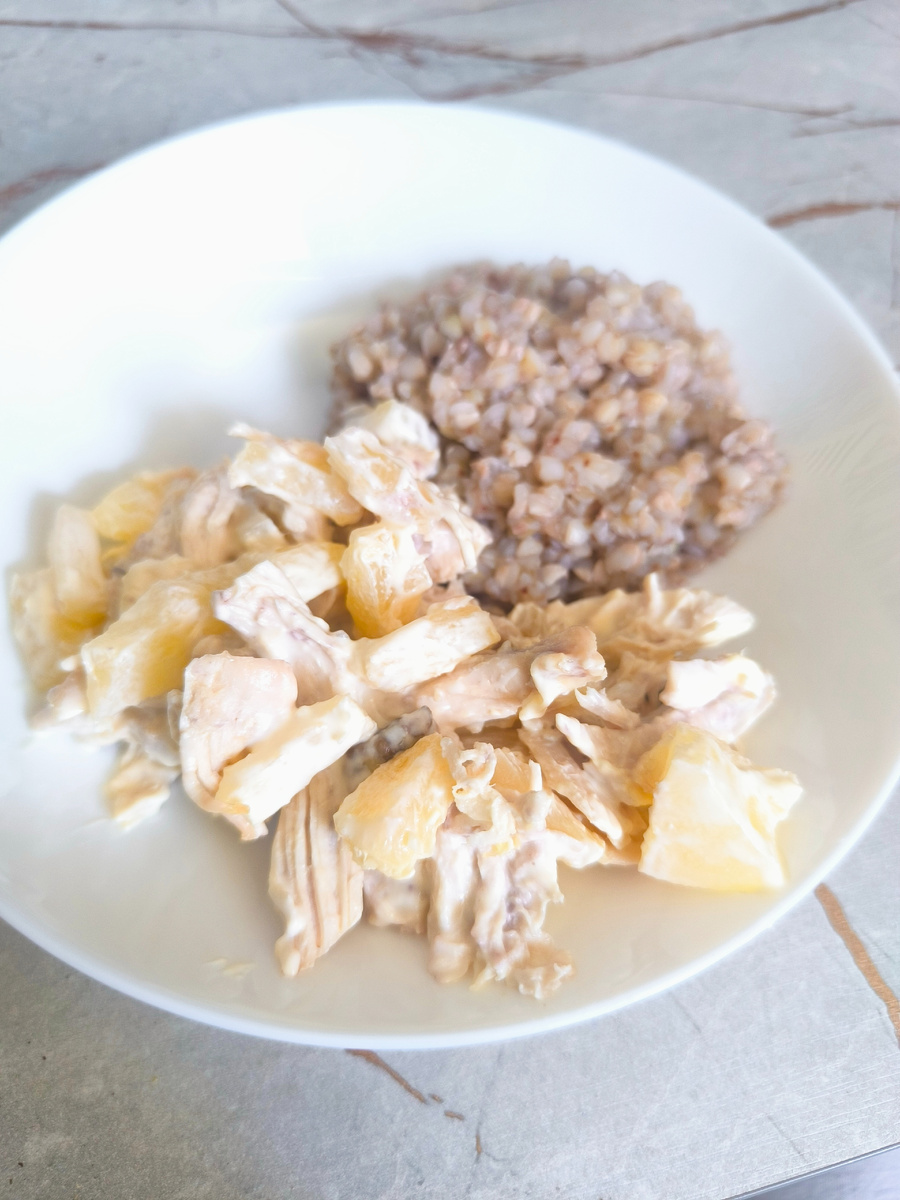 Салат курица с ананасом , зеленая гречка.