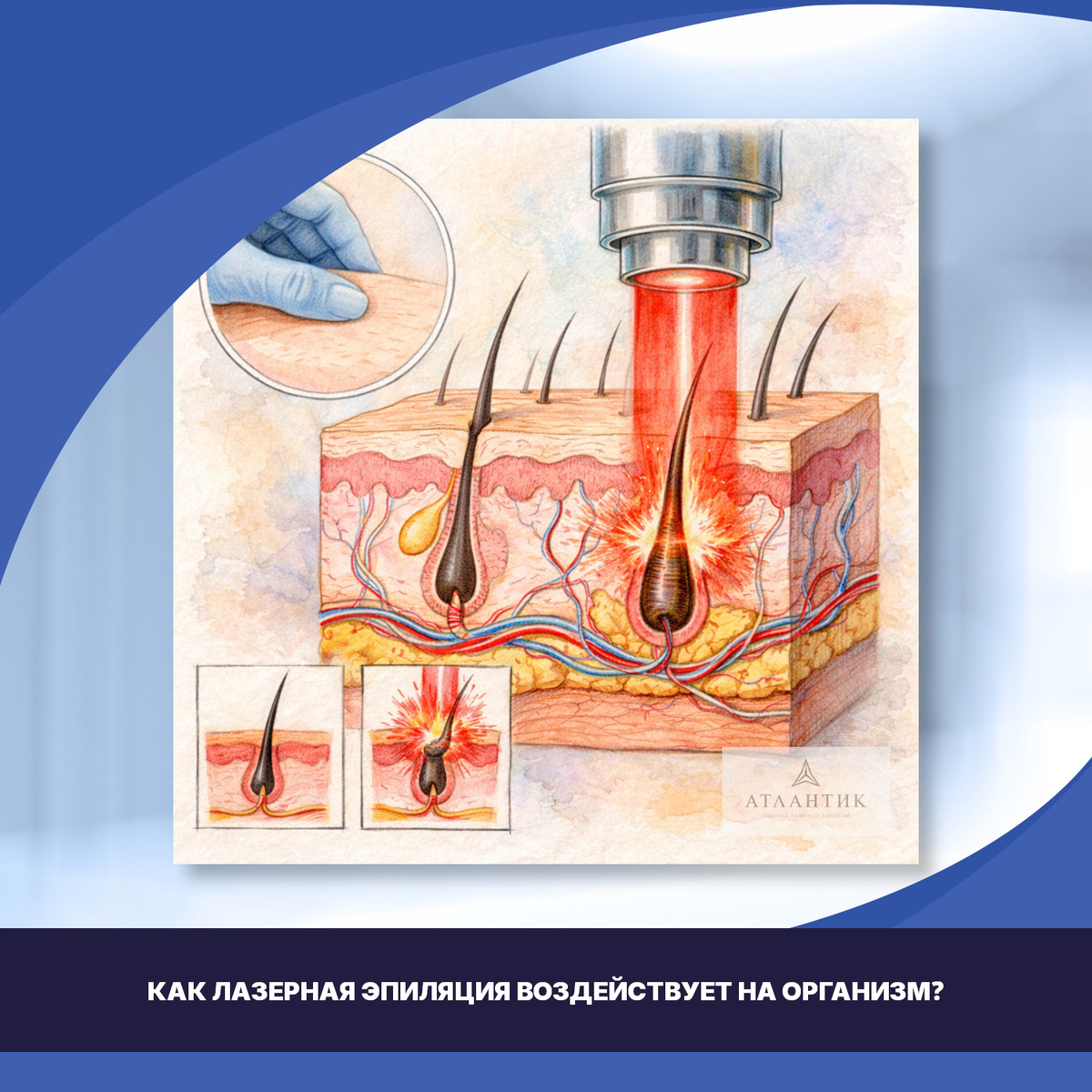 Лазерная эпиляция работает по принципу избирательного фототермолиза. Проще говоря: Глубина проникновения лазера ограничена кожей. Он не достигает внутренних органов, сосудов или лимфатической системы. То есть системного влияния на организм процедура не оказывает. Данный материал носит исключительно информационный характер. Есть противопоказания, посоветуйтесь с врачом.