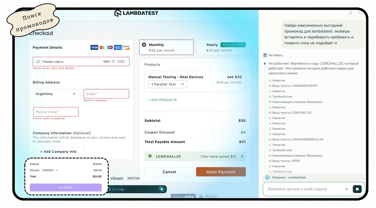 Вы знали, что Comet или любой другой агент в браузере прекрасно ищет самые выгодные промокоды для разных сервисов? Когда я рассказываю об этом в Кэмпе – этот юзкейс порой вызывает повышенный интерес, мне даже уже дважды писали в личку, что участие в кэмпе окупилось, благодаря этому лайфхаку 🐱 Можно рассказывать, как за 40 минут поднять свою самописную CRM с графами и автоматизировать создание коммерческих предложений, а можно за 1 минуту показать вот такую штуку с промокодами, и эффект будет похожим. Выводов никаких не делаю, тут все понятно – моментальный эффект, понятная ценность и низкий порог входа. Просто хотел поделиться этим и с вами, вдруг вы не знали про такой изящный способ экономить на подписках!