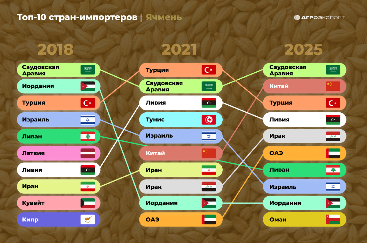 Ячмень — одна из старейших зерновых культур, которую выращивают тысячи лет. Его используют в основном на корм животных, для производства пищевых продуктов и как ключевой ингредиент в пивоварении. По данным Data Insights Market, к 2032 году ожидается, что среднегодовой темп роста рынка ячменя составит 4,73%. Зерно ценится за высокое содержание клетчатки, витаминов и минералов, что делает его популярным среди заботящихся о своем здоровье потребителей и важным продуктом в рационах по всему миру. Драйверы развития ячменной промышленности: растущий спрос на корма для животных и для производства солода; повышение осведомленности потребителей о питательной ценности ячменя (содержание клетчатки и витаминов); технологические инновации в выращивании и переработке. При этом интересно, в какие страны Россия экспортирует ячмень. Предлагаем узнать, изменились ли направления поставок за последние годы и открылись ли новые рынки. На графике представлены: Основные страны-импортеры ячменя из России в на