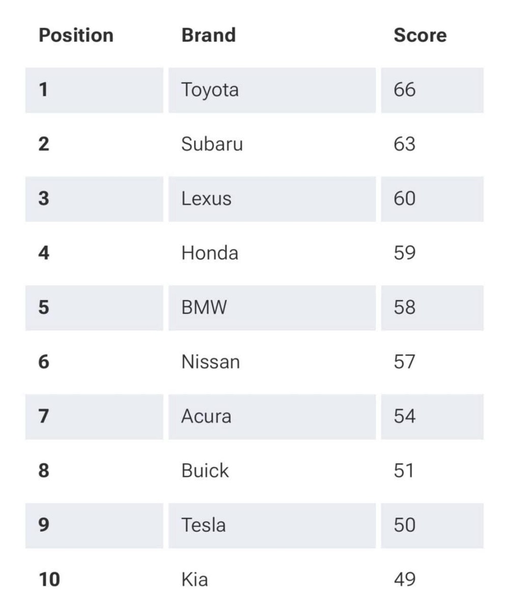 Toyota снова стала лидером рейтинга самых надёжных автомобилей, опередив Subaru на три балла