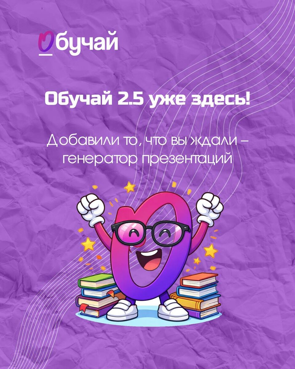 🚀 #ОБНОВЛЕНИЕПЛАТФОРМЫ@obuchaicom Теперь это не просто платформа для обучения – это полноценный инструмент, который помогает быстро собирать уроки и сразу превращать их в готовые материалы. В обновлении Обучай 2.5 мы добавили то, чего больше всего не хватало: – генератор презентаций внутри платформы – автоматическую структуру слайдов под тему и класс – гибкое оформление под ваш стиль – стабильную и быструю работу без сбоев и VPN. Теперь не нужно собирать презентации вручную – всё можно сделать в одном месте за считанные минуты. Попробуйте обновление сервиса Обучай. Новым пользователям дарим -40% по промокоду «ПРИВЕТ!». Обучай — сервис для учителей 🙄