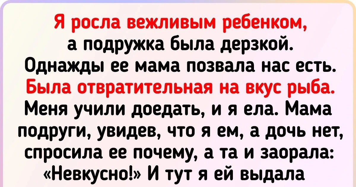 Я росла очень вежливым ребенком, а подружка была дерзкой. Однажды ее мама позвала нас есть. Была отвратительная на вкус рыба, запеченная с кашей. Меня учили доедать всегда, и я ела. Мама подруги, увидев, что я ем быстро, а дочь не ест, спросила ее, почему так, а та и заорала: «Мам, невкусно!» И тут я ей выдала: «Алина, молчи, мне тоже невкусно, но я же ем!» Мама ее очень смеялась. Оказалось, что она рыбу пересолила просто. © sokolllihhha / Pikabu