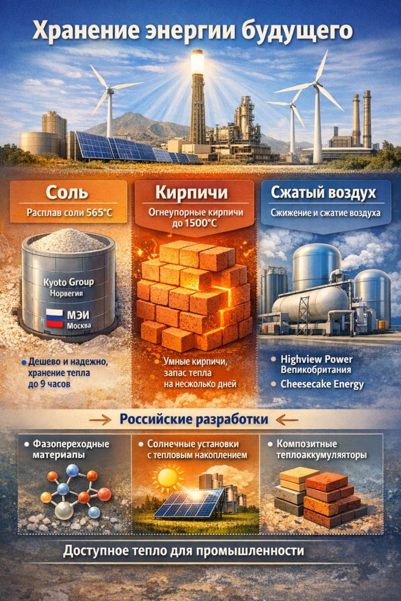 Пока все говорят про литий-ионные батареи, в тени растёт революция в тепловых накопителях. Они дешевле, долговечнее и идеально подходят для промышленности, где нужно именно тепло. Разбираемся, что уже работает и что разрабатывают в России. 🌍 🧂 Соль — горячий хит Норвежская Kyoto Group нагревает вертикальные резервуары с солью — тепло хранится месяцами. Соль дешёвая, нетоксичная, выдерживает тысячи циклов. 🇷🇺 По-нашему: Учёные МЭИ (Москва) создали солнечную электростанцию с накоплением энергии в расплаве соли при 565°C. Станция работает ночью до 9 часов, КПД — 32% (на 7,4% выше мировых аналогов). 🧱 Кирпичи, которые «помнят» тепло Американская Rondo делает тепловые батареи из огнеупорных кирпичей: нагрев до 1 500°C, хранение — несколько дней, цена в 2 раза ниже водорода. 🇷🇺 По-нашему: Специалисты УрФУ совместно с китайскими коллегами разработали «умные» кирпичи с фазопереходным материалом (парафин). Они снижают теплопотери на 15–25%, а в жарком климате увеличивают теплоёмкость с