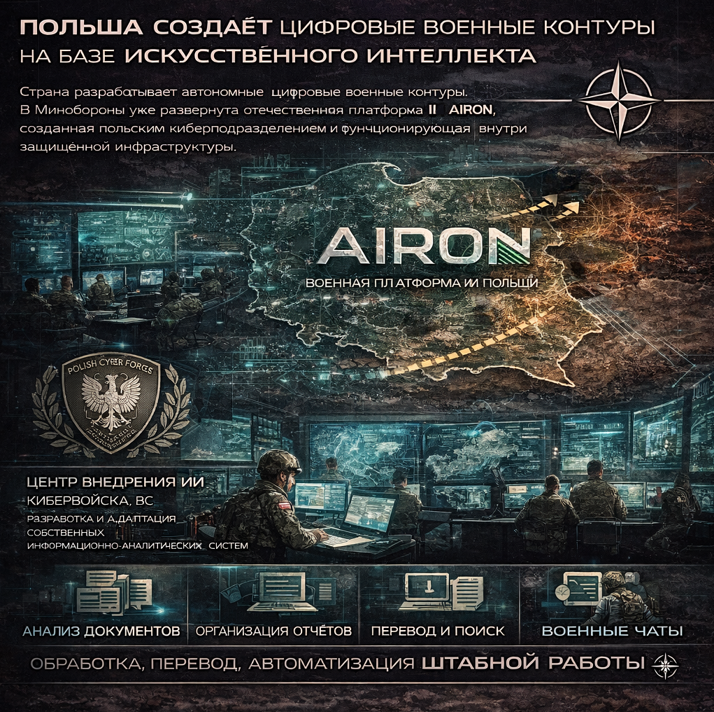 Польша переходит от закупки технологий к формированию собственных цифровых военных контуров. В Министерстве обороны уже развёрнута платформа искусственного интеллекта AIRON, созданная польским киберподразделением и функционирующая внутри защищённой инфраструктуры. Разработка выполнена силами Центра внедрения ИИ при компоненте войск кибернетической безопасности. Ключевая задача — замещение коммерческих решений, которые в условиях военного планирования рассматриваются как риск утечки данных и внешнего контроля. Таким образом, Варшава формирует автономный слой обработки информации, интегрированный в военную систему управления. Функционально AIRON повторяет базовые возможности гражданских ИИ-платформ, но адаптирован под военные задачи. Система обеспечивает анализ документов, автоматическое формирование отчётов, перевод, обработку данных и создание специализированных чат-решений. Поддерживается работа с основными форматами — от текстовых файлов до таблиц и массивов данных, что позволяет исп