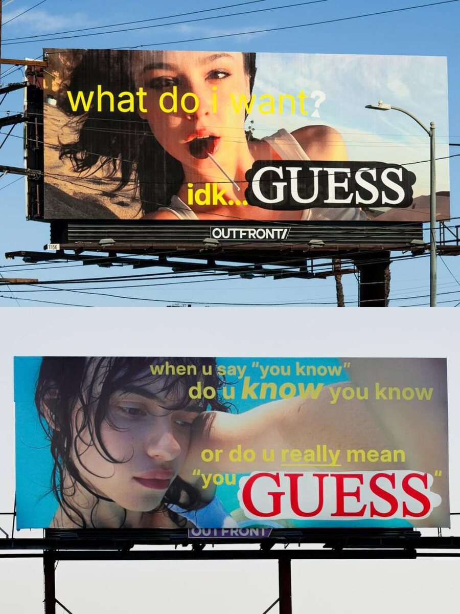 “поиска себя” в рекламной кампании «Idk… Guess» 2026. «Визуально, через эстетику и интонации, кампания отсылает к периоду взросления поколения Z — когда они открывали и исследовали свою привлекательность через бесконечные селфи. Создать ощущение личного фотоархива телефона авторам помогло нарочито плохое качество съёмки на устаревшую модель iPhone 5c. Короткие копирайты напоминают интригующие подписи в ленте соцсетей того времени. Можно сказать, что это один из первых примеров ностальгии, которую испытывает новое поколение. Кампания получилась очень искренней и сексуальной, хотя ещё недавно казалось, что говорить о сексуальности стало неловко и даже опасно. Guess удалось найти деликатный способ вернуть эту тему без покушения на женскую субъектность». В проекте приняли участие начинающие креаторы, модели и другие интернет-героини из Лос-Анджелеса, на улицах которого «архивные» кадры появились в формате наружной рекламы. Девушки также стали соавторами кампейна, публикуя брендированный