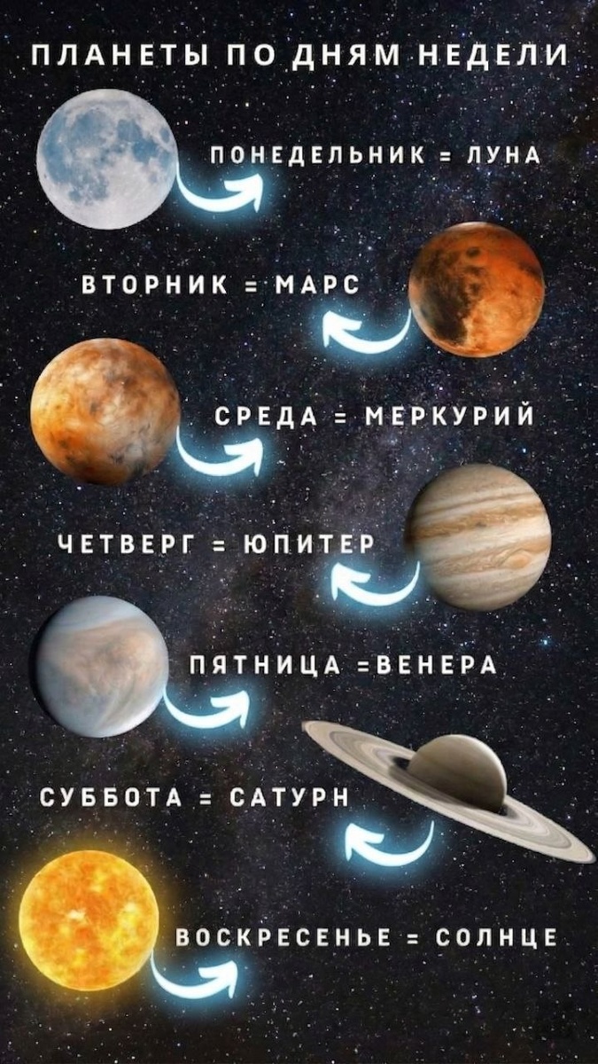Мы часто идём против потока — и устаём. А у каждого дня уже есть своя энергия. Если её учитывать — жизнь становится проще. Воскресенье (Солнце) — про свет внутри. Хорошо отдыхать, наполняться, быть в радости. Понедельник (Луна) — про чувства и дом. Мягкость, забота, простые дела. Вторник (Марс) — действовать. Решительно, быстро, без лишних сомнений. Среда (Меркурий) — общение и дела. Переговоры, обучение, деньги. Четверг (Юпитер) — рост. Работа, наставники, большие задачи. Пятница (Венера) — любовь и красота. Творчество, отдых, удовольствие. Суббота (Сатурн) — пауза и итоги. Тишина, порядок, честность с собой. Не ломайте ритмы —научитесь в них жить