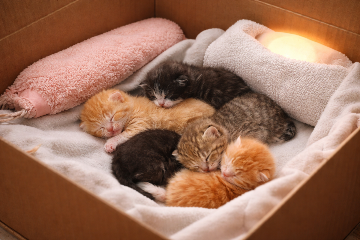 Для обогрева используют грелки, бутылки с теплой водой, или специальные непромокаемые электроковрики, обязательно обернутые тканью, чтобы избежать ожогов. Важно оставить часть «гнезда» без подогрева, чтобы котенок мог охладиться, если ему станет жарко. Температура в первые недели жизни котят должна поддерживаться на уровне около 29–32 °C.