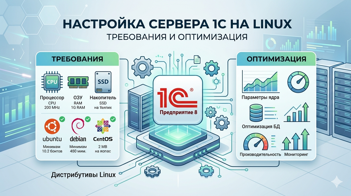 1С:Предприятие одна из самых распространённых систем автоматизации бизнеса в России и странах СНГ. Однако перенос сервера 1С с Windows на Linux вызывает у администраторов ряд сложностей. Во-первых, официальная документация 1С фрагментирована и разбросана по разным источникам (ИТС, портал 1С, форумы). Во-вторых, типичная конфигурация «сервер 1С + PostgreSQL на одном железе» требует тонкой настройки параметров ядра, лимитов процессов и СУБД. В-третьих, 1С предъявляет специфические требования к файловой системе, оперативной памяти и сетевым настройкам. Без учёта этих требований производительность падает, а кластер начинает «сыпаться» ошибками. В этой статье мы развернём сервер 1С на Linux (Ubuntu Server 22.04 LTS), настроим PostgreSQL, оптимизируем параметры системы и решим типичные проблемы, такие как «Too many open files».