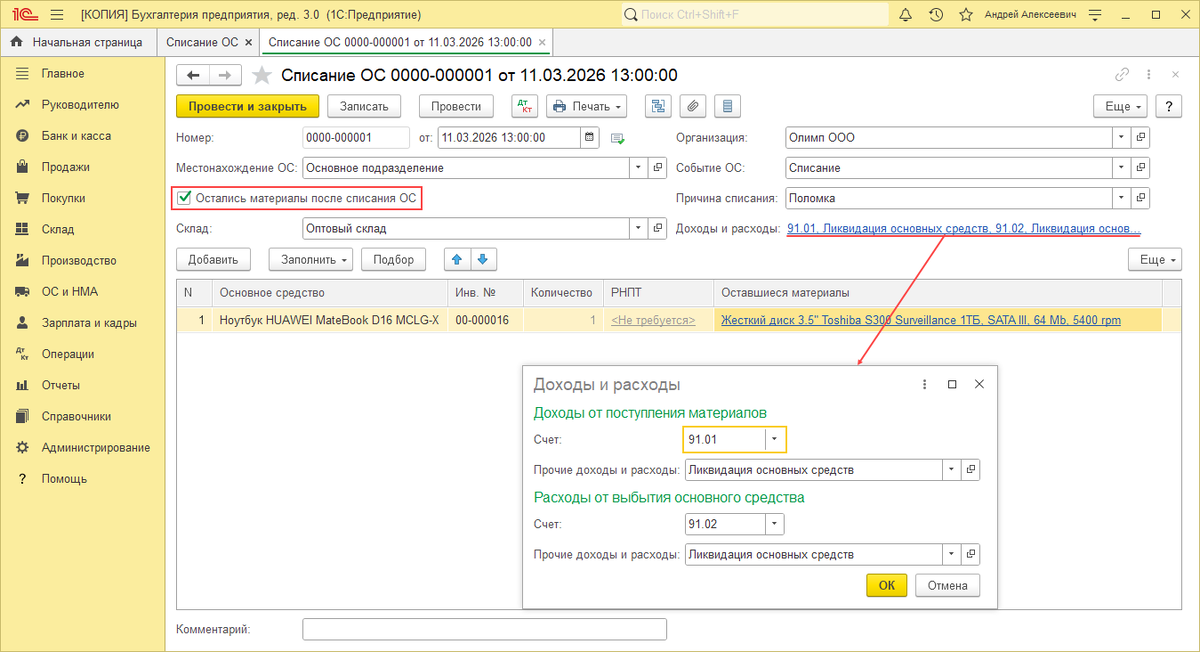 1. Раздел ОС и НМА – Списание ОС. 2. Кнопка "Создать". 3. В поле "Местонахождение" укажите подразделение, в котором находится списываемый объект ОС. 4. В поле "Событие ОС" выберите (при необходимости создайте новое) событие с видом "Списание", в поле "Причина списания" укажите причину списания. 5. По ссылке в поле "Доходы и расходы" откройте одноименную форму и выберите счета учета доходов и расходов, на которые будут отнесены доходы и расходы от выбытия ОС, и субконто к ним. 6. Если при выбытии ОС были извлечены материальные ценности, установите флажок "Остались материалы после списания ОС". 7. По кнопке "Добавить" заполните табличную часть документа: 8. Кнопка "Провести и закрыть". Наши консультанты с опытом более 30 лет помогут всё настроить, объяснят и покажут, как сделать правильно. Работаем по всей России — подключимся удалённо и разберёмся вместе. Помощь по 1С (клик сюда) > 🔔 Следите за новостями в нашем ТГ канале. 🔔 Следите за новостями в ВК. Клик сюда. 🔔 Следите за новостя