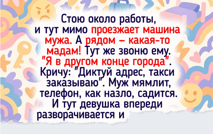 - Стою около работы, и тут мимо проезжает машина мужа. А рядом — какая-то девица! Тут же его набираю. «Я в другом конце города». Кричу, мол, говори адрес, такси заказываю. Мямлит что-то, а у меня, как назло, телефон садится. Как вдруг сзади девушка спокойно так говорит: «Девушка, не надо вызывать такси. Садитесь в мою машину, сейчас мы этого сказочника догоним!» Я даже глазом моргнуть не успела, как мы уже летели по трассе за его машиной. Такого поворота и такого «союзника» мой благоверный точно не ожидал! Видели бы вы лицо мужа, когда мы через пять минут «прижали» его к обочине! А теперь эта незнакомка моя лучшая подруга.