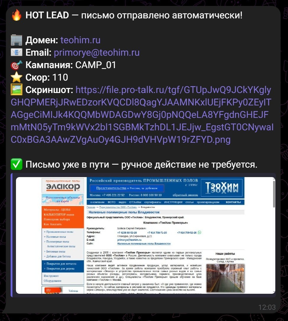 в полноценный центр автоматизации B2B-продаж. Если вы занимаетесь холодными рассылками, этот инструмент возьмет на себя самую рутинную часть: от поиска и анализа сайтов до отправки персонализированных писем. Что умеет этот «Комбайн»? * 🎯 Глубокий Lead Scoring: Система автоматически анализирует сайт потенциального клиента (CMS, адаптивность, наличие аналитики, год копирайта) и выставляет балл качества лида. * 👁Vision API & Скриншоты: Благодаря интеграции с ProTalk API, скрипт может делать скриншоты сайтов и использовать нейросети для визуальной оценки дизайна. * 📧 Умные рассылки и фоллоу-апы: Автоматическая отправка цепочек писем через Gmail с соблюдением лимитов и графиков работы. * 🤖 AI-персонализация (GPT): ИИ пишет уникальные «ледоколы» для каждого письма, основываясь на данных о компании. * ⚖️ A/B Тестирование: Вы можете тестировать разные промпты для ИИ, а система сама выберет наиболее конверсионный вариант. * 🔥 Hot Leads в Telegram: Как только система находит