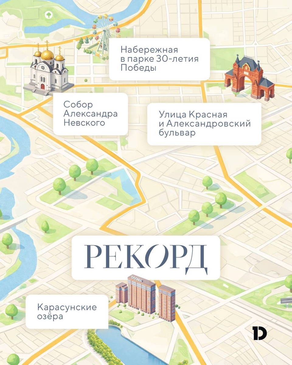 Так, квартал «Рекорд» расположен в центре Краснодара. Главное преимущество — уникальная близость к историческим местам и достопримечательностям. Карасунские озёра, музеи, храмы и другие достопримечательности центрального района — возле дома.